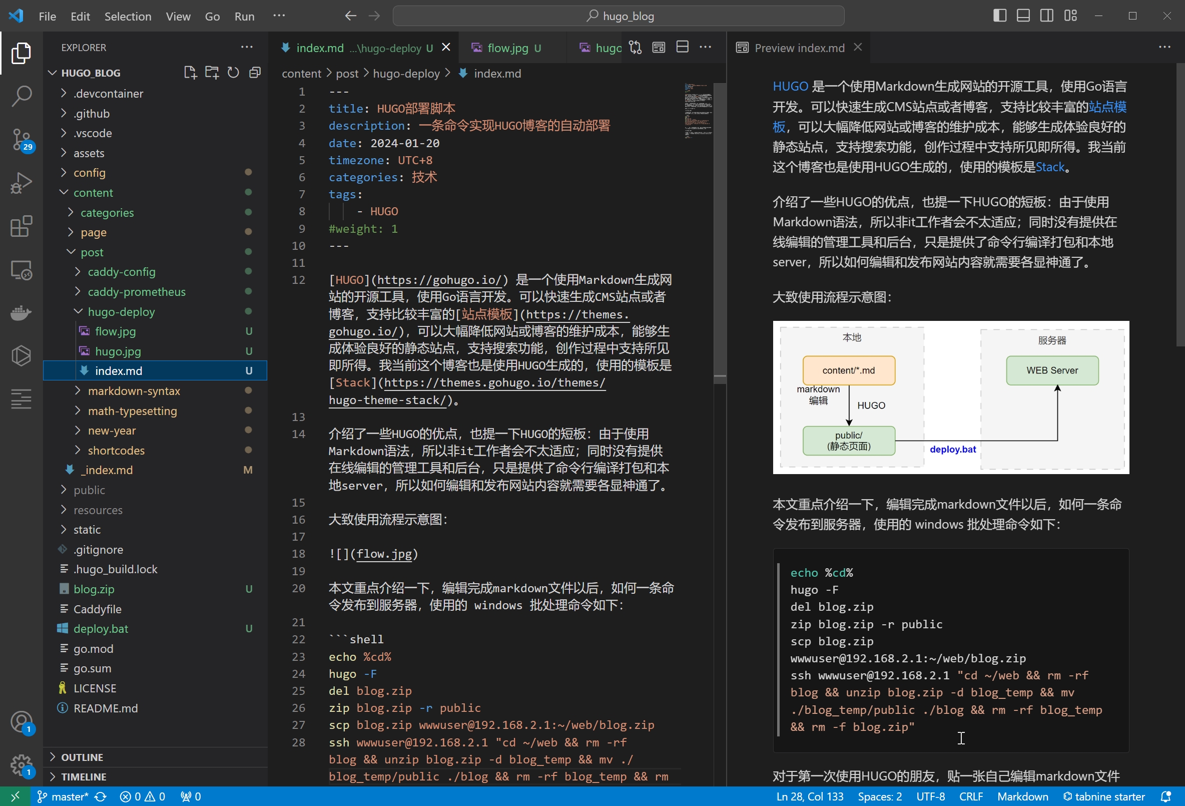 对于第一次使用HUGO的朋友,贴一张自己编辑markdown文件过程中的截图(VSCode),相信可以帮助理解HUGO的使用。